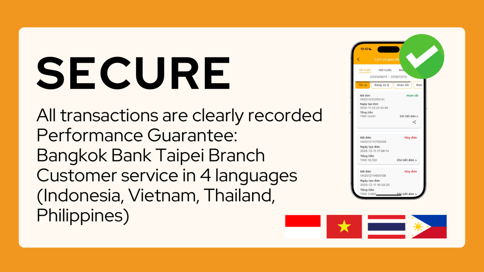 Our services cover Indonesia, Vietnam, Philippines and Thailand, providing legal, safe and fast remittance services for migrant workers 24 hours a day, 365 days a year.